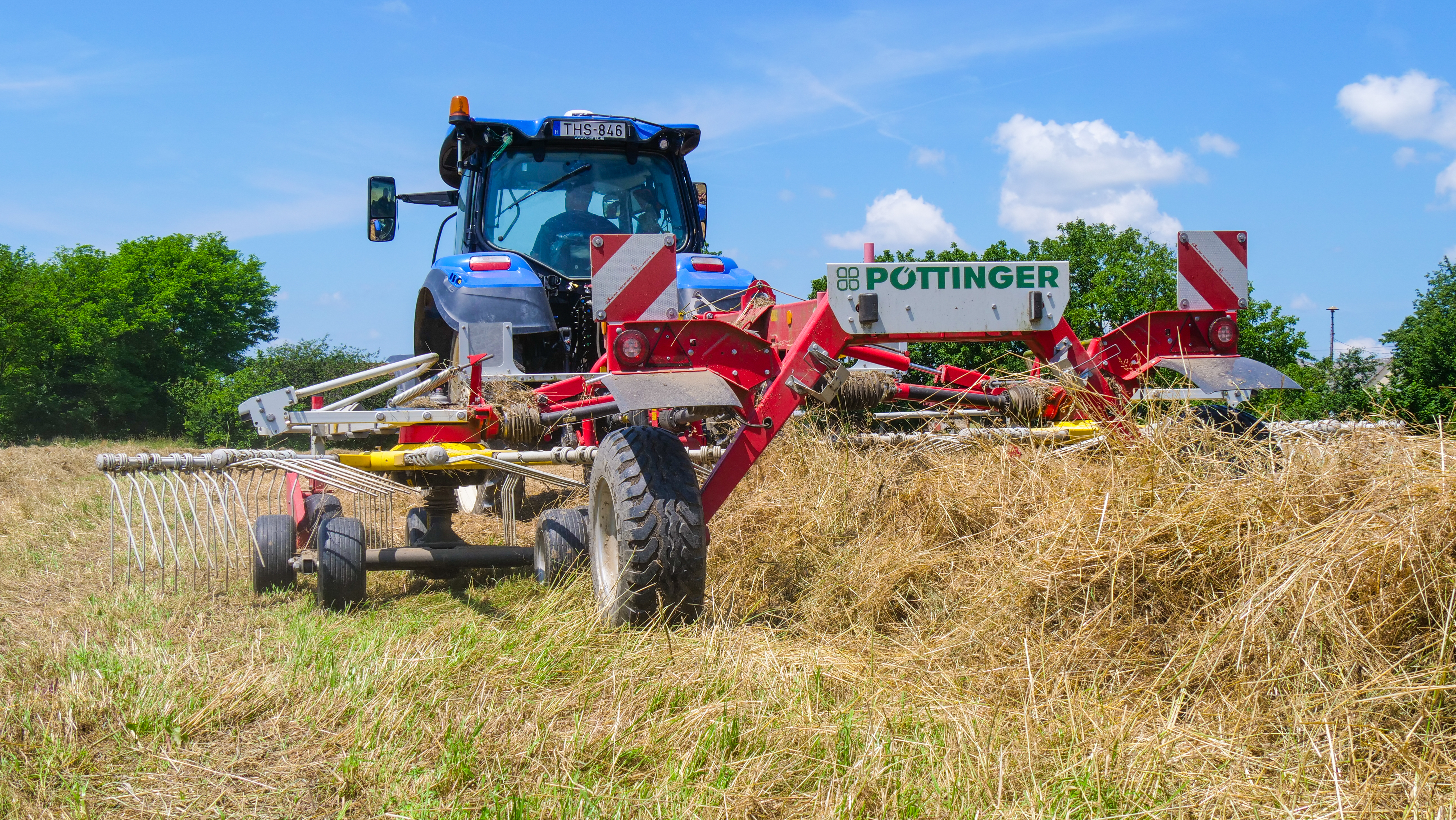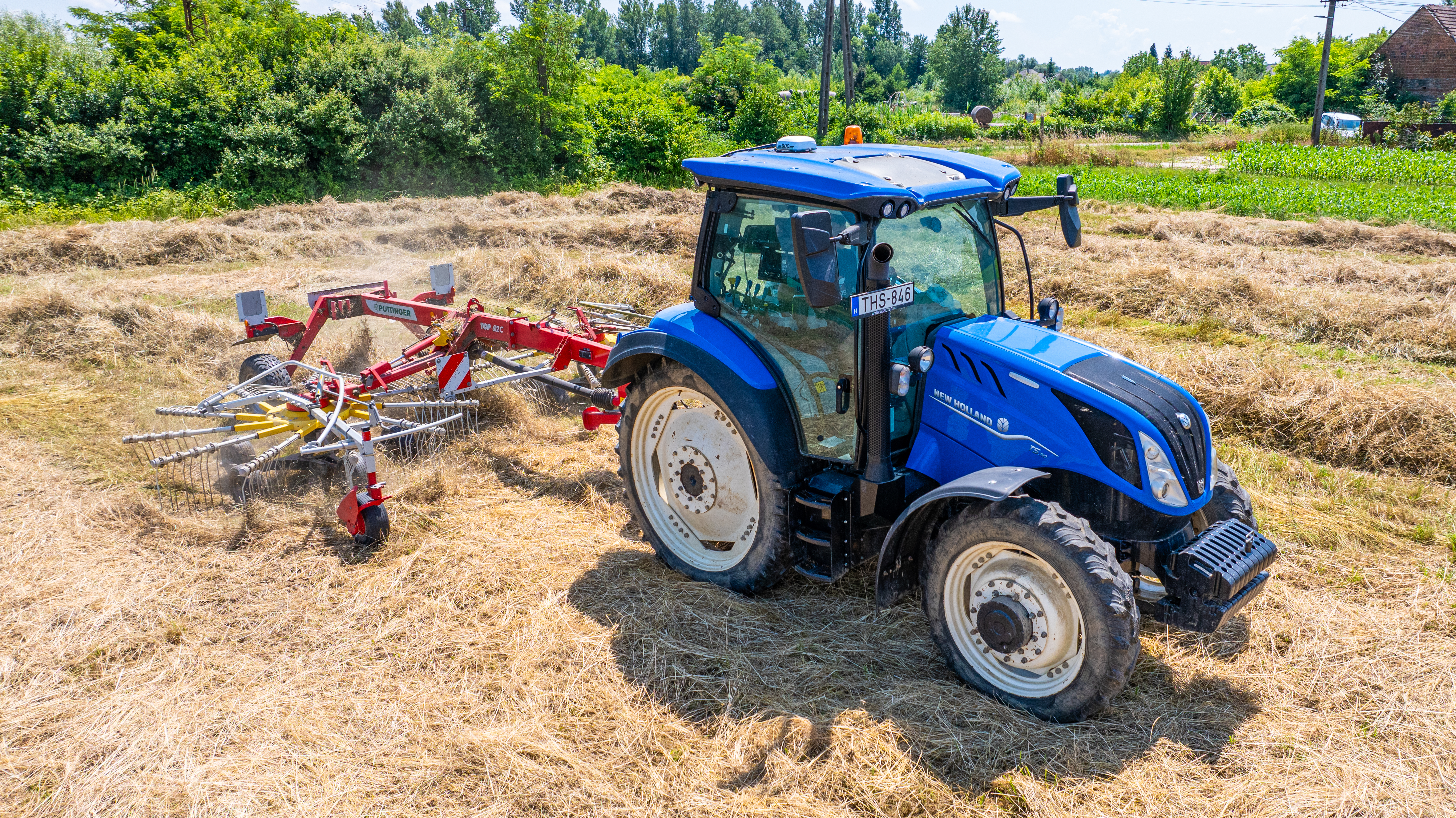 A bedobóujjak és a sodró egyaránt nagyon finoman állítható, fél centiméteres pontossággal, így teljes a kontroll, hogy a lehető legtöbb takarmányt gyűjtsük össze nulla szennyeződéssel. Az eszközökkel egy New Holland T5.110 Dynamic Command erőgéppel dolgozunk, a területekig rossz minőségű utakon haladunk, így nálunk az is előny, hogy a Pöttinger rendterítőből van függesztett változat, ami kiemeléskor is a kerékre, hátsó tengelyre terheli a súlyt, csökkentve ezzel a hibalehetőségeket. A rendsodrónál ugyanilyen okból fontos a félig függesztett szerkezet, mindkét gép elképesztően stabil, masszív strapabíró, csak ajánlani tudom őket.”
