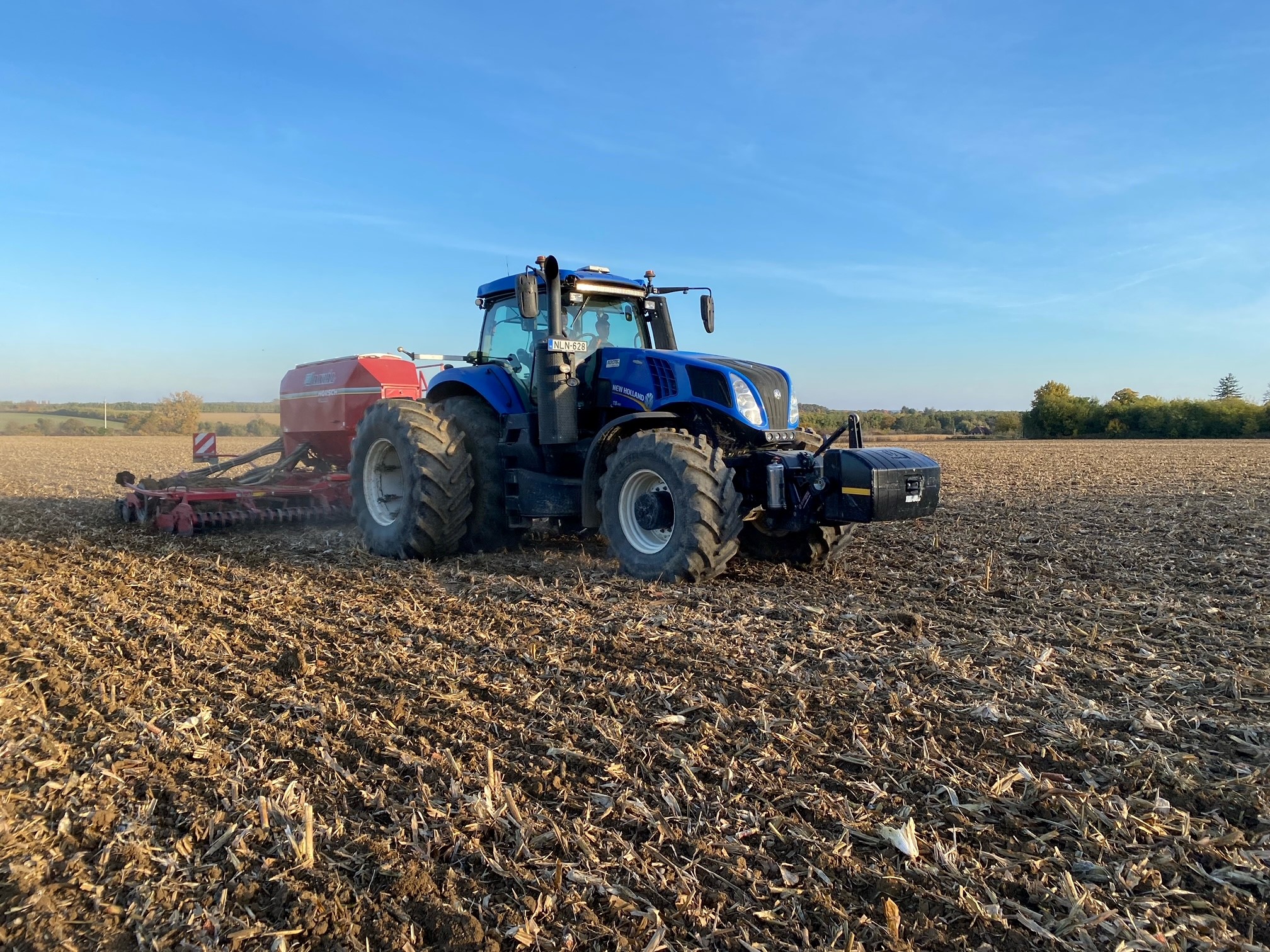 „A New Holland T8 traktorunk egy 8 soros Horsch vetőgépet húz kukoricában, míg más kultúrákban ugyanilyen gyártmányú 6 méteres vetőgéppel oldjuk meg a vetést precíziós gazdálkodási eszközökkel, RTK korrekció segítségével. A stratégiánknak megfelelően a T8-asnak jóval több olaj van a váltójában, erőteljesebb a hidraulikaszivattyúja, mint azt a munkagépek indokolnák. Ezzel maximális teljesítményen sem okoz gondot a vetés. Fokozatmentes váltóval ráadásul az üzemanyagfogyasztás körülményektől függetlenül kedvező.”