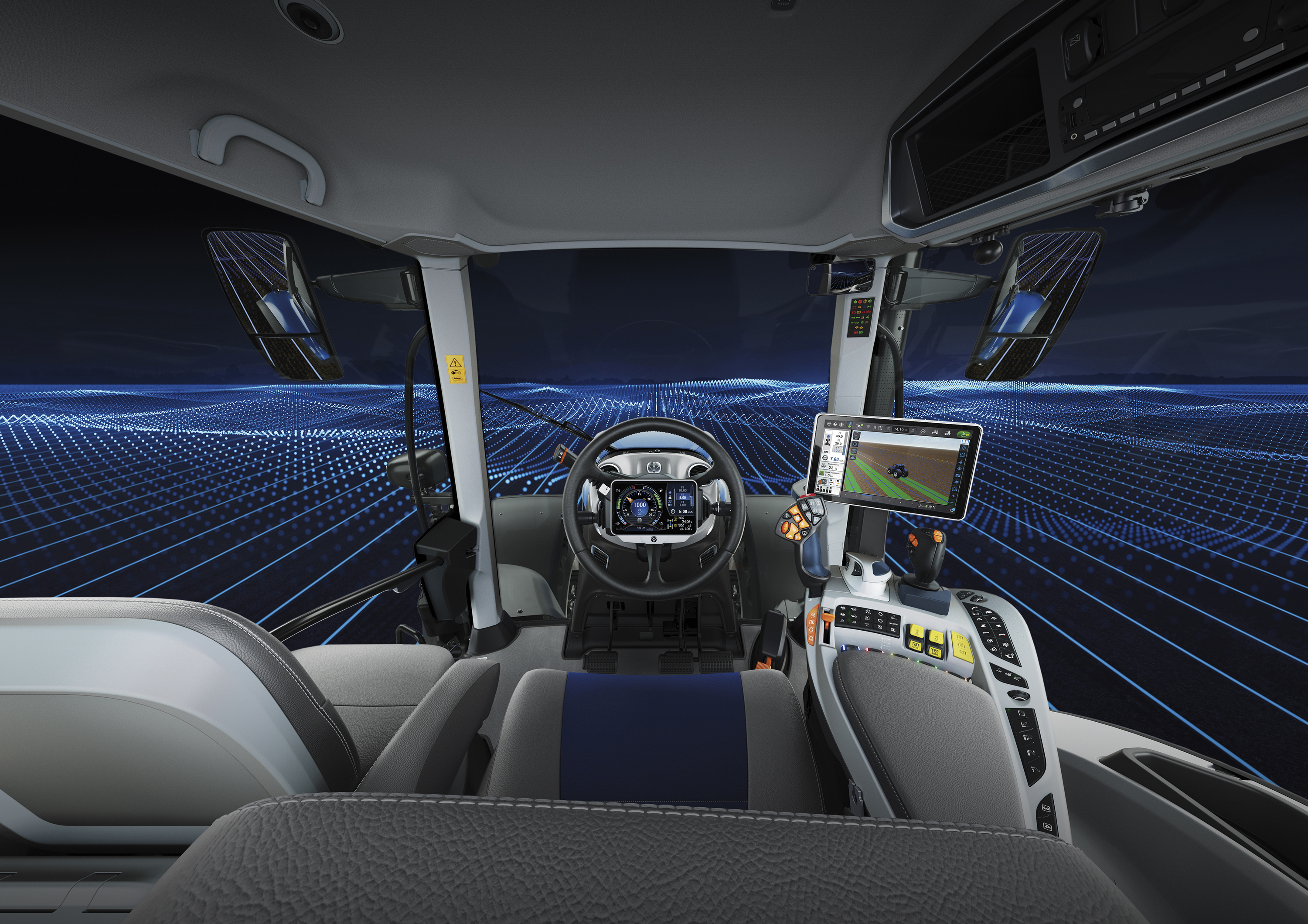 A T7 HD megőrzi a T7 sorozat “családi érzetét”, ugyanakkor olyan tágas munkakörnyezetet biztosít, ahol a gépkezelő sokkal komfortosabban érzi magát. A kabin hosszabb lett, így még több helyet biztosít az utas számára, és nagyobb lett a padlófelület is. A vásárlók nagyra fogják értékelni a rendelkezésre álló bőséges tároló kapacitást: az ülés mögötti 30 literes tároló rekeszben kényelmesen elhelyezhetők a gépkezelő személyes tárgyai; továbbá egy 12 literes hűtött rekesz; fedett tároló rekesz az utasülés mögött USB töltő csatlakozóval és áramellátás csatlakozóval; nyitott tároló helyek a fülke jobb oldalán, és egy hálós tároló hely a mennyezet oldalában. Az áttervezés a kilátást is még jobbá tette előre és hátra lefelé a 3-pontra és a munkagépre, ezzel együtt pedig a nagyobb biztonsághoz kamerákkal figyelhetők a traktor körüli holtterek. A 24 LED fényszórót tartalmazó új munkalámpa csomag éjszaka is garantálja panoráma kilátást a traktorra és a munkagépre.