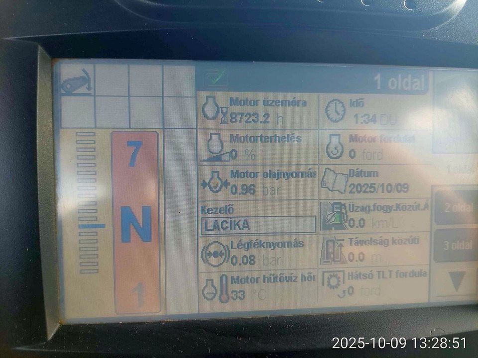 6,7 literes motor 200 LE-s névleges/250 LE max. teljesítménnyel, 50 km/h-s 19x6 fokozatú Full Powerhift váltó, rugózott első híd és kabin, fékezett első híd, fronthidraulika, tömbsúly, mellső TLT, 540E/1000 TLT fordulat, 4 pár elektromosan vezérelt kihelyezett hidraulika kör, légrugós ülés, utasülés, légfék 31,85 tonna vontatással, 2026.03. hóig érvényes műszaki vizsga, elöl 80%-os 540/65R30 méretű Green, hátul 600%-os 650/65R42 méretű Alliance gumik, Sidewinder kartámasz, IntelliView III-as monitor, 8723 üzemóra.